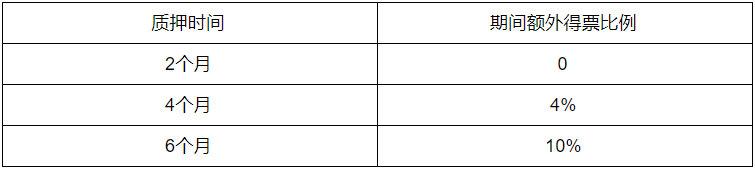 为增加用户的换票热情,早期质押换票者将额外得到一定的票数,于质押开放日(3月20日)就质押换票的用户,将获得4%的额外票数,这个奖励每天减少0.1%,直到主网上线结束。